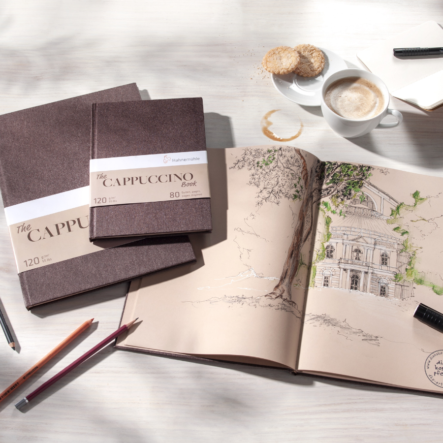 El color marrón claro de este cuaderno de esbozo recuerda a un café capuchino recién espumado siendo un tono de fondo excelente para dibujos en tonos cálidos.