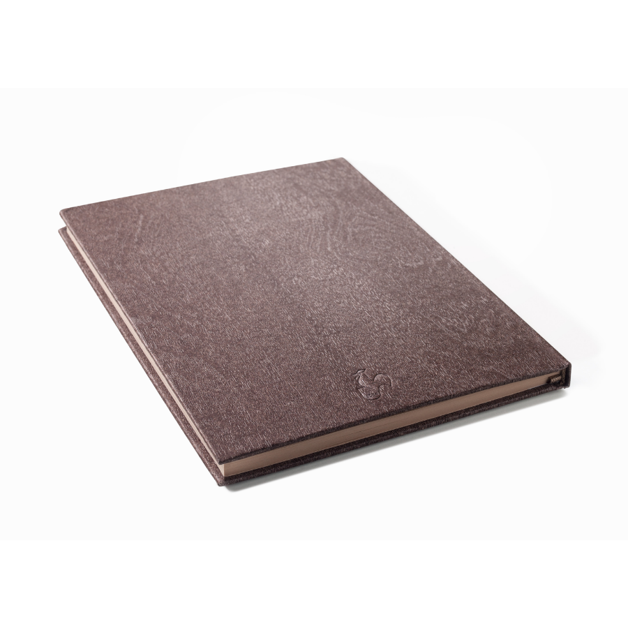 - Tapa dura de color marrón oscuro y tacto delicado que recuerda a la madera noble.