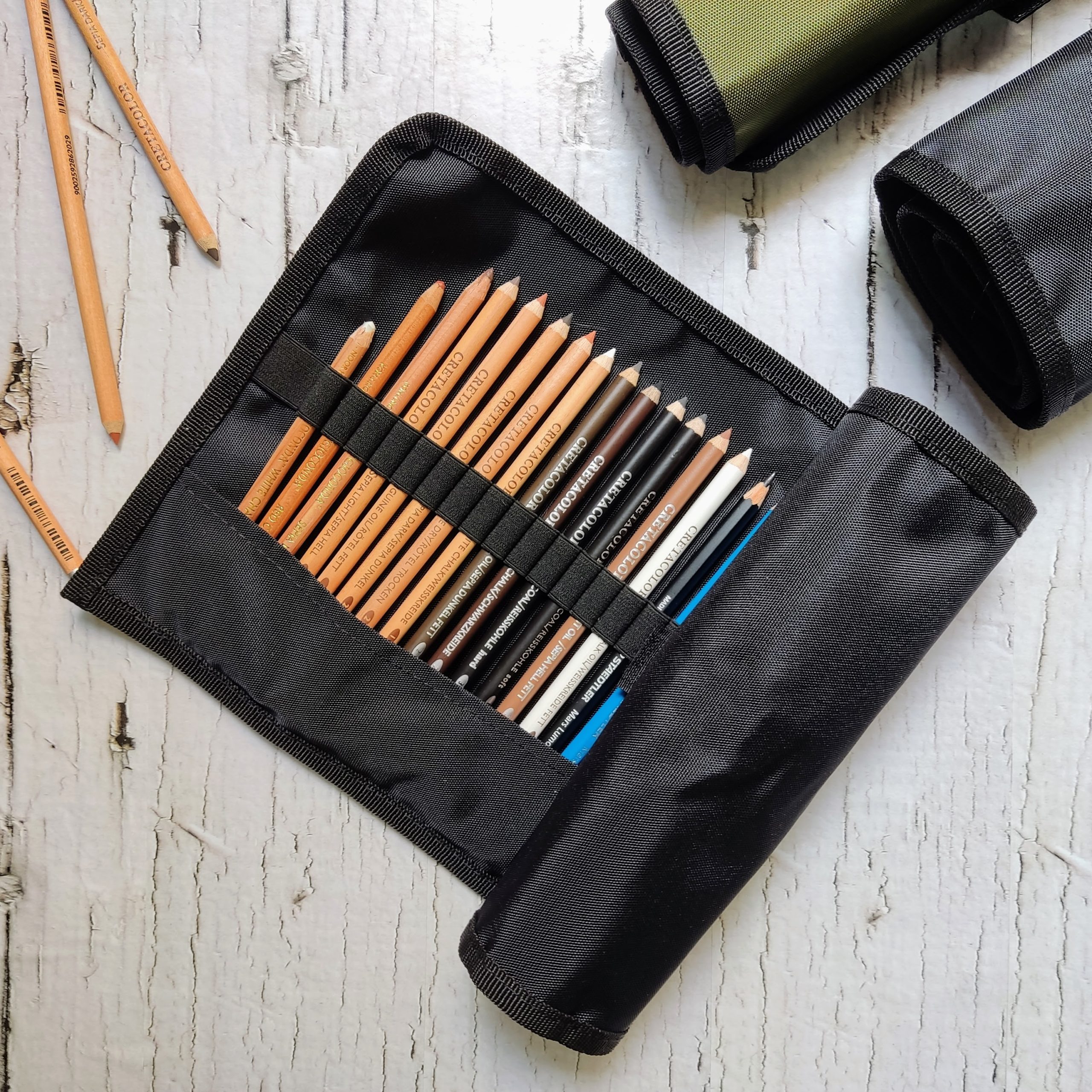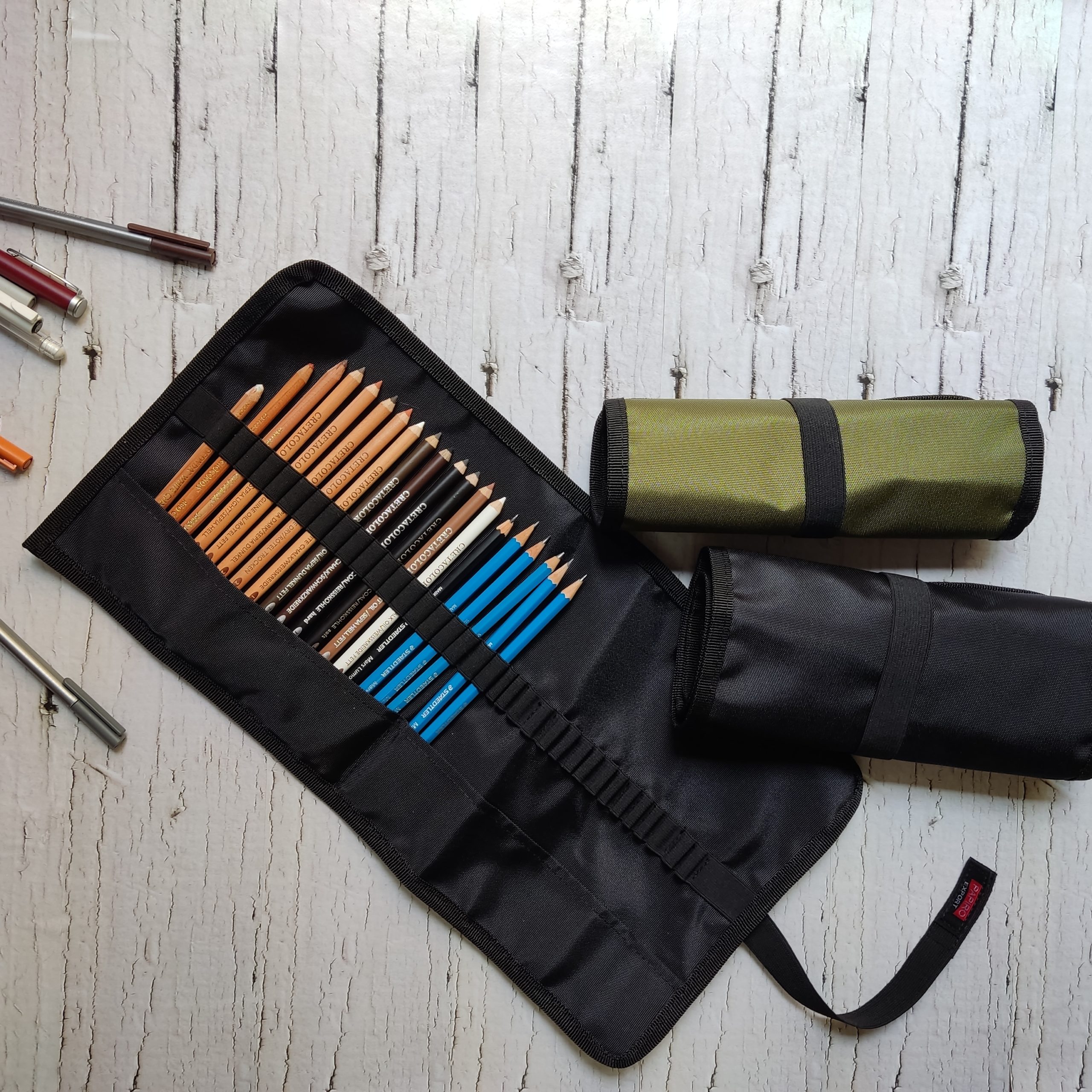 Estuche enrollable de tela ideal para guardar lápices, colores, rotuladores delegados, lapiceros, difuminos y mas. Los estuches tienen ligas gruesas que aseguran los lápices y enrollarlos con facilidad.