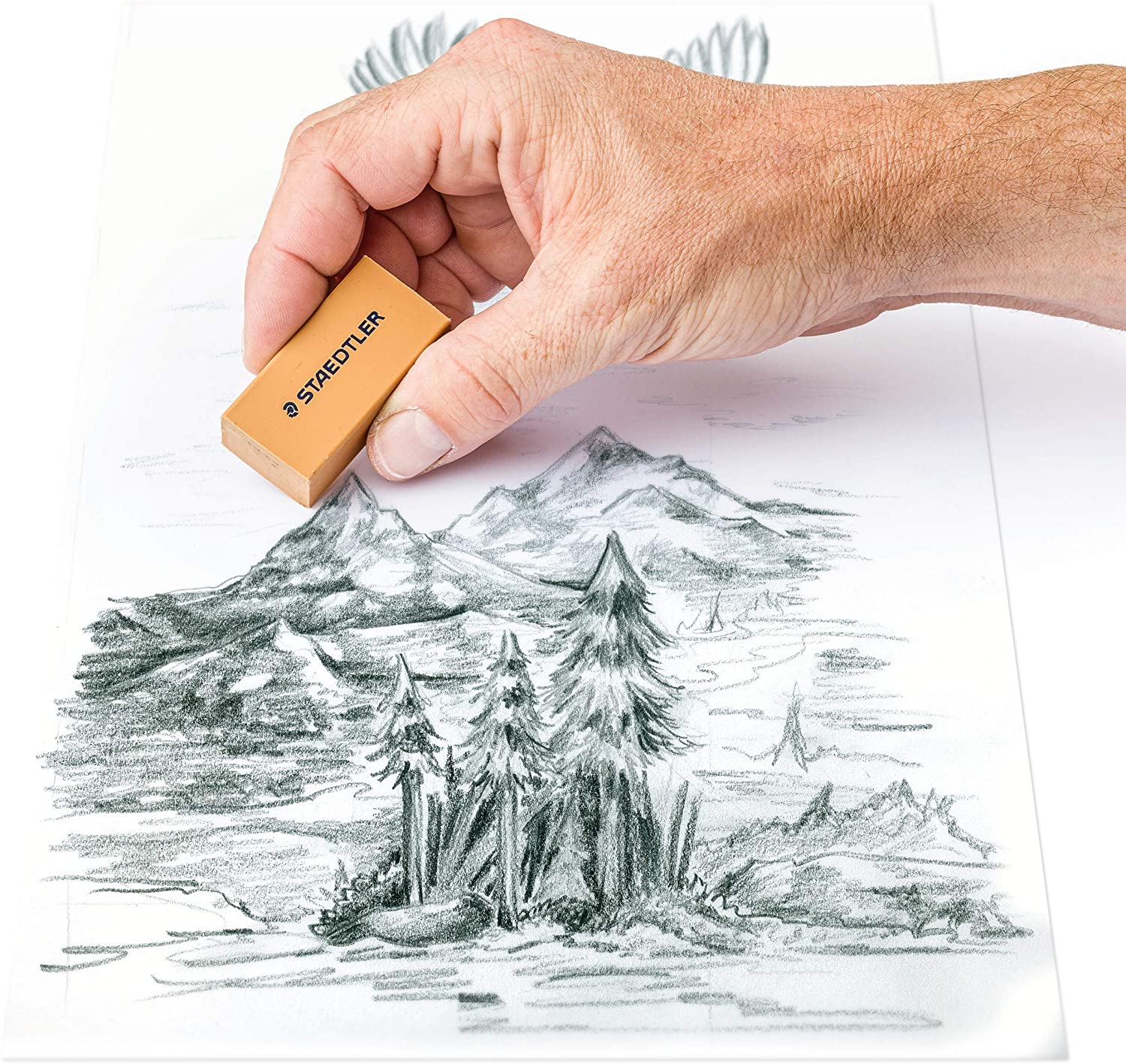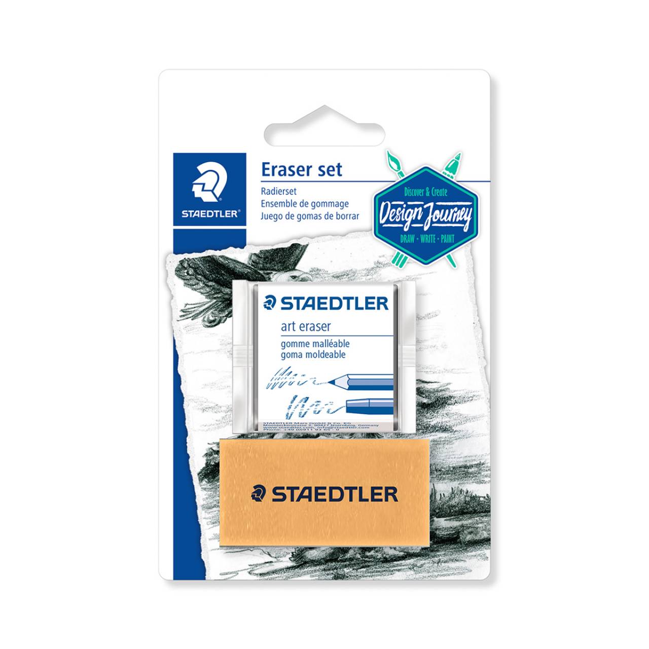 El set contiene una goma moldeable gris , suave para limpiar residuos de grafitos o carboncillo. También contiene una goma dura para borrar al raspar.