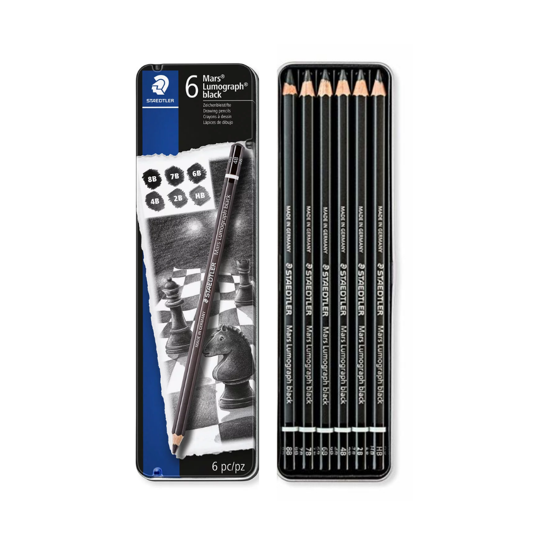 • Lata de 6 lápices Staedtler Mars Lumograph Blacks es la opción ideal si buscas un grafito de negro más profundo y mate, especialmente pensado para dibujo, esbozo y sombreado. A diferencia de un lápiz tradicional, su mina tiene una formulación especial con alta proporción de carbono, lo que ayuda a lograr un tono negro azabache con muy buen rendimiento en sombras, contrastes y fondos. Es una excelente elección para estudiantes de arte, arquitectura, diseño e ilustración, y también para cualquier persona que quiera un lápiz confiable para uso diario con un acabado más oscuro.