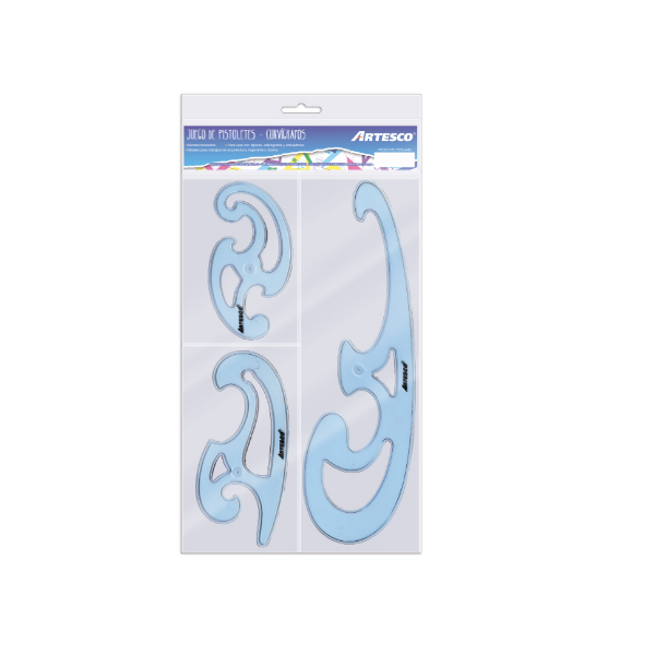 Tres pistoletes universales. Bordes biselados para usar con lápiz, estilógrafos y rotuladores.