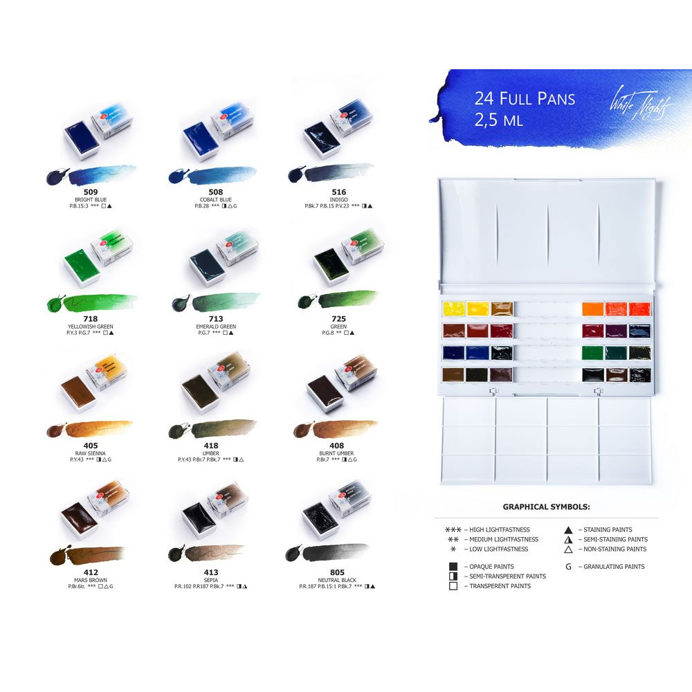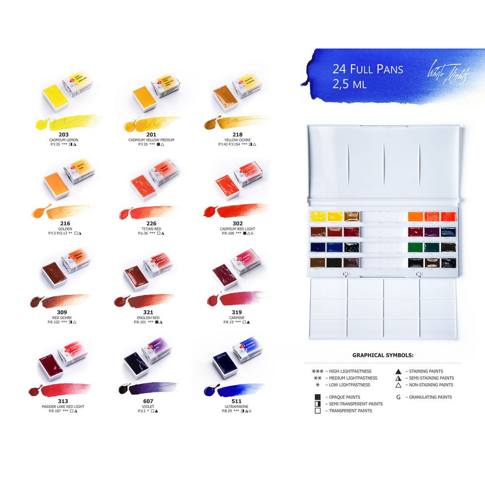 Las acuarelas artísticas profesionales «White Nights» son suspensiones finas de pigmentos y rellenos en un aglutinante, que incluye una solución acuosa de pegamento vegetal: goma arábiga. Todas las acuarelas de la paleta White Nights son seguras, certificadas y cumplen con las normas ASTM D-4236.
