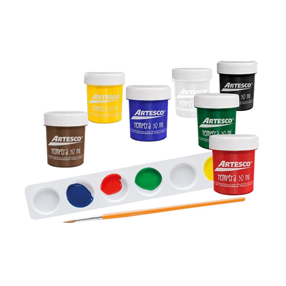 Las témperas de la marca Artesco vienen en un set que incluye siete colores, una paleta para colocar los colores que usarás y un pincel. Los colores que vienen dentro de la caja son azul, blanco, amarillo, rojo, marrón, negro y verde. En cada uno de estos envases tiene 30 ml de pintura para que puedas hacer los dibujos que necesites sobre cartón, papel, cartulina o un lienzo. Además, mayormente los piden dentro de la lista de útiles escolares de los niños en primaria, pues son una gran herramienta para que puedan aprender a pintar sin salirse de las líneas.