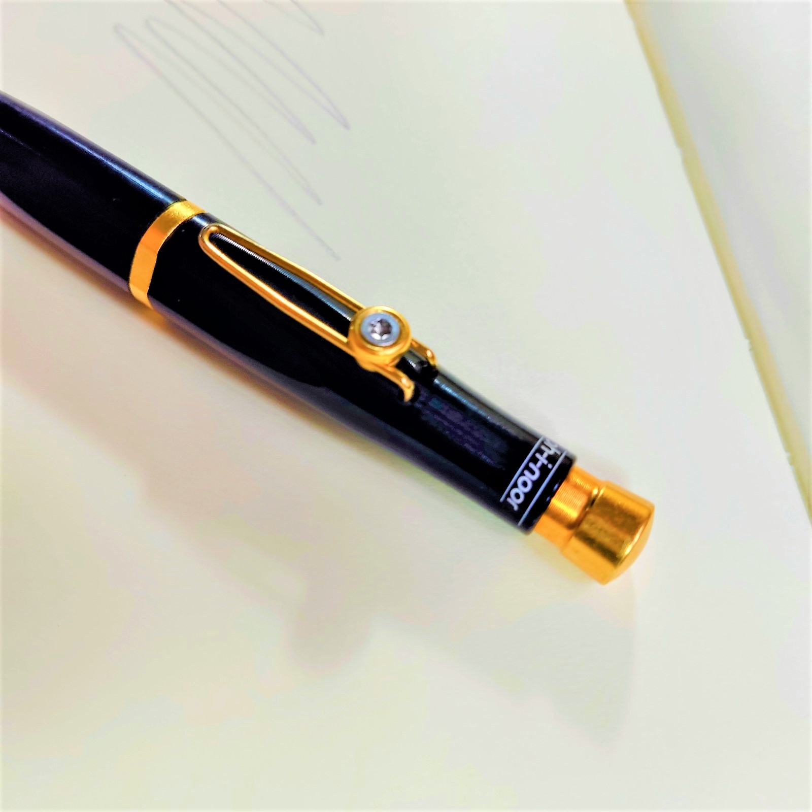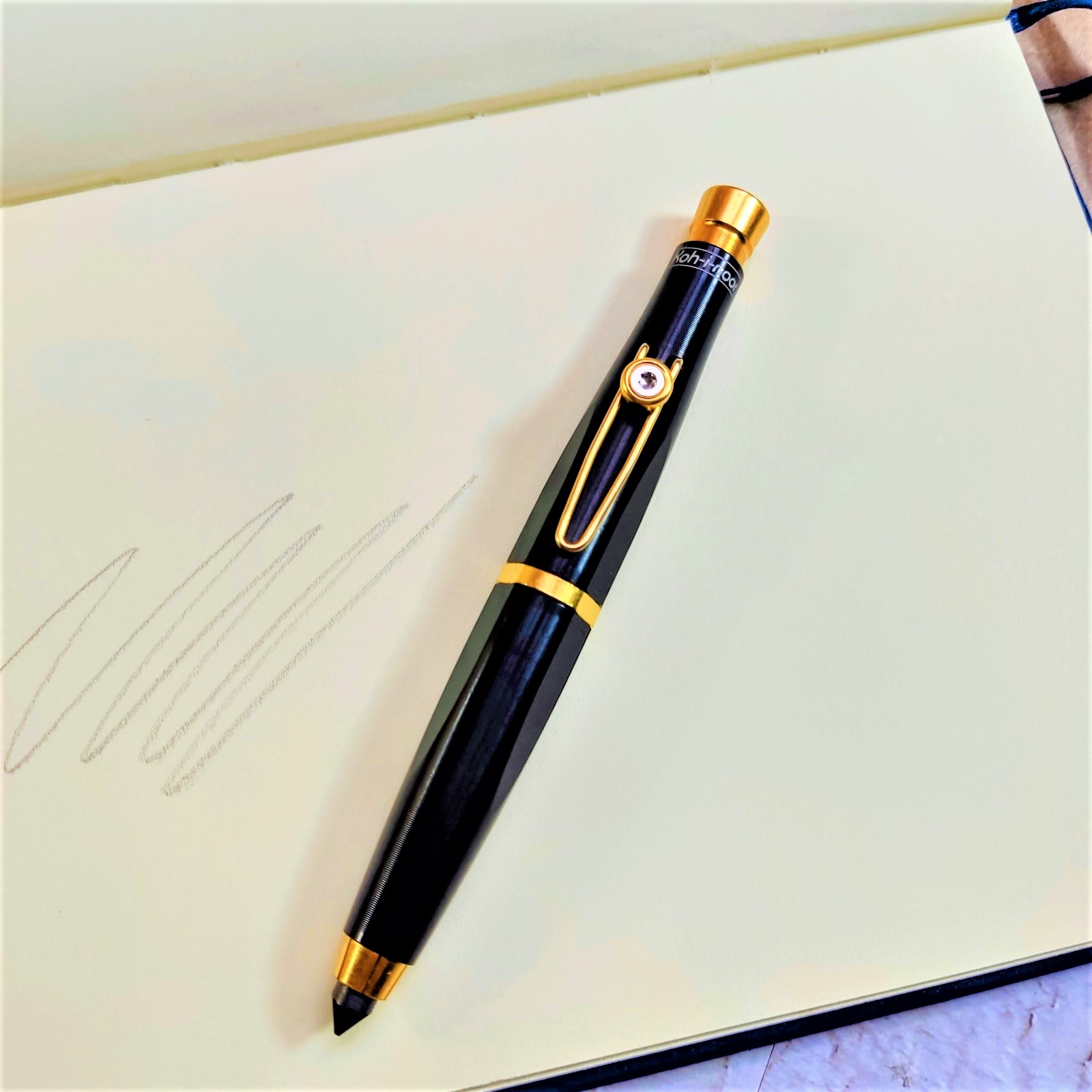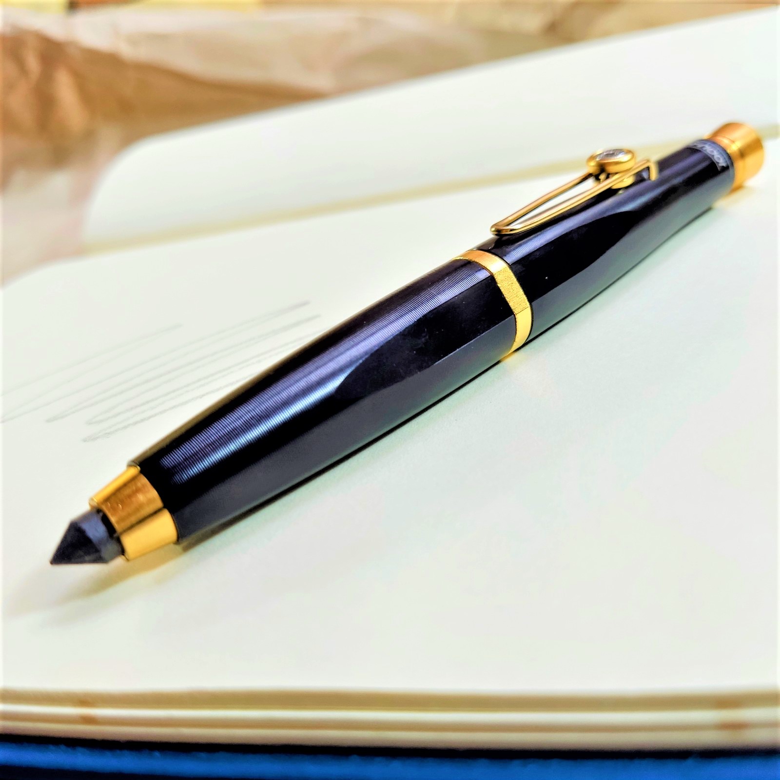 Portaminas de metal, utilizado para escritura y dibujo común con mina de 5.6 mm de diámetro. El cable se mueve presionando la perilla en la posición inclinada, lo que abre la abrazadera y el cable se desliza hacia afuera según sea necesario. La mina se puede afilar, la perilla debe estar desenroscada y el afilador está dentro de la perilla. El sobre tiene perfil redondo con 3 planos longitudinales en tratamiento de oxidación anódica roja, los componentes son dorados, clip de alambre. El portaminas se guarda en un estuche de PET transparente.